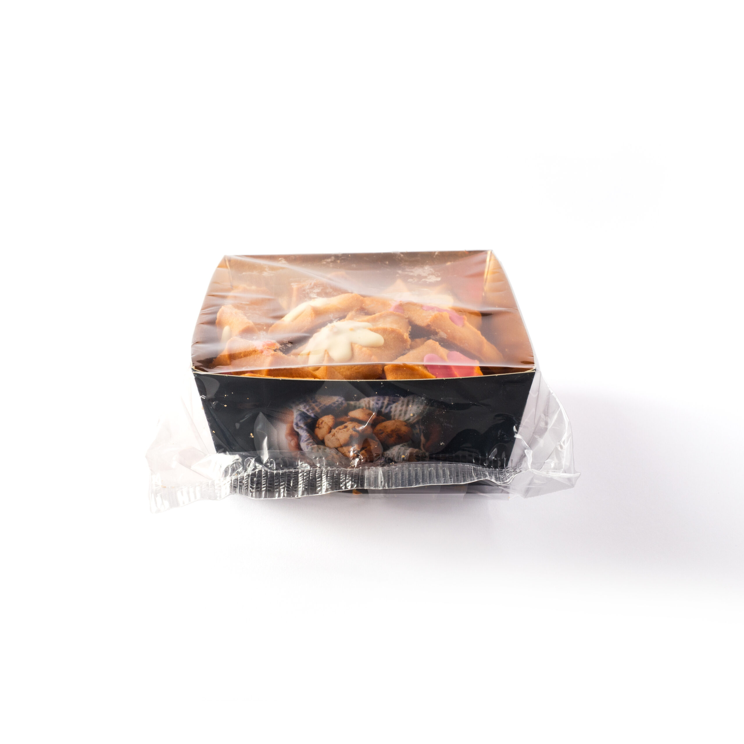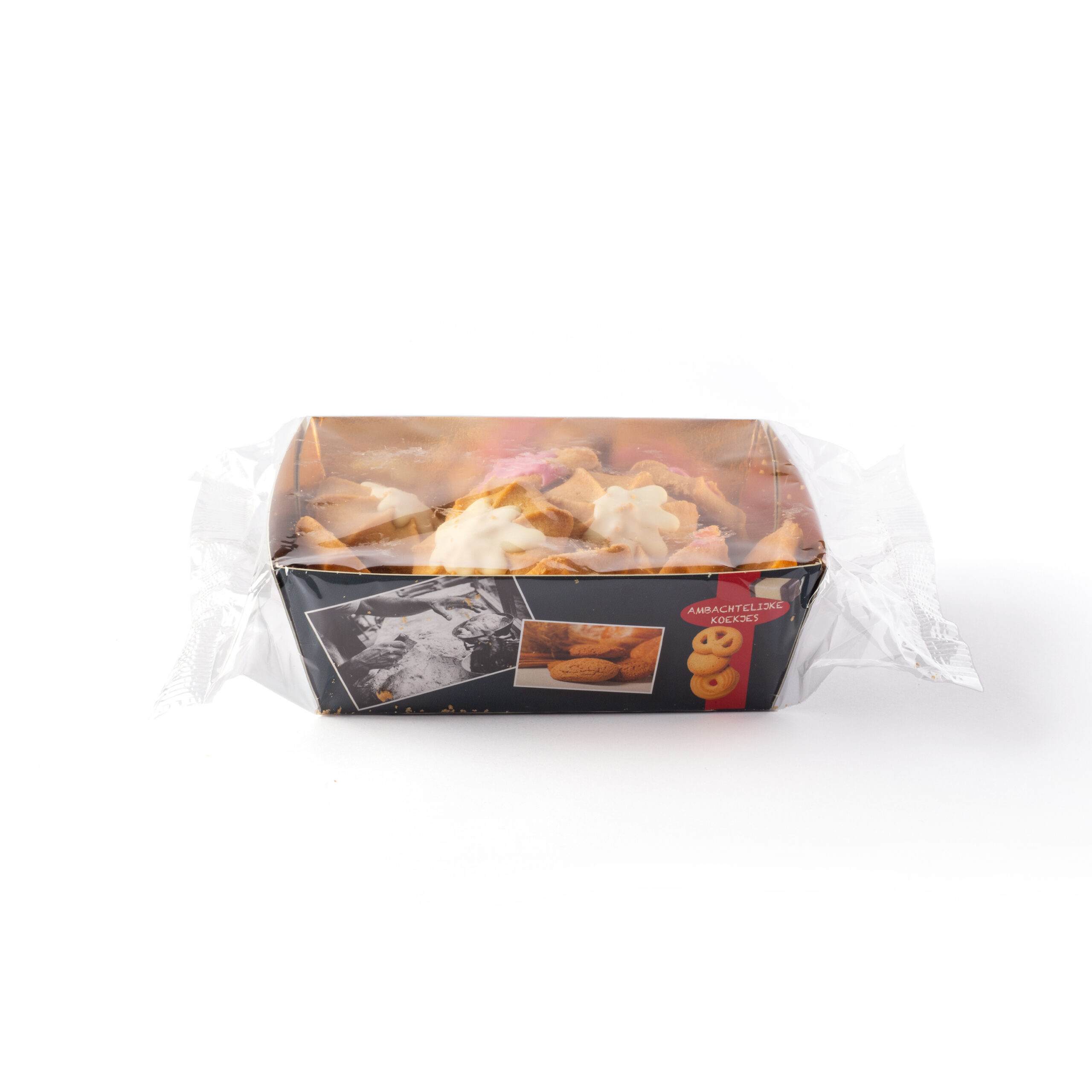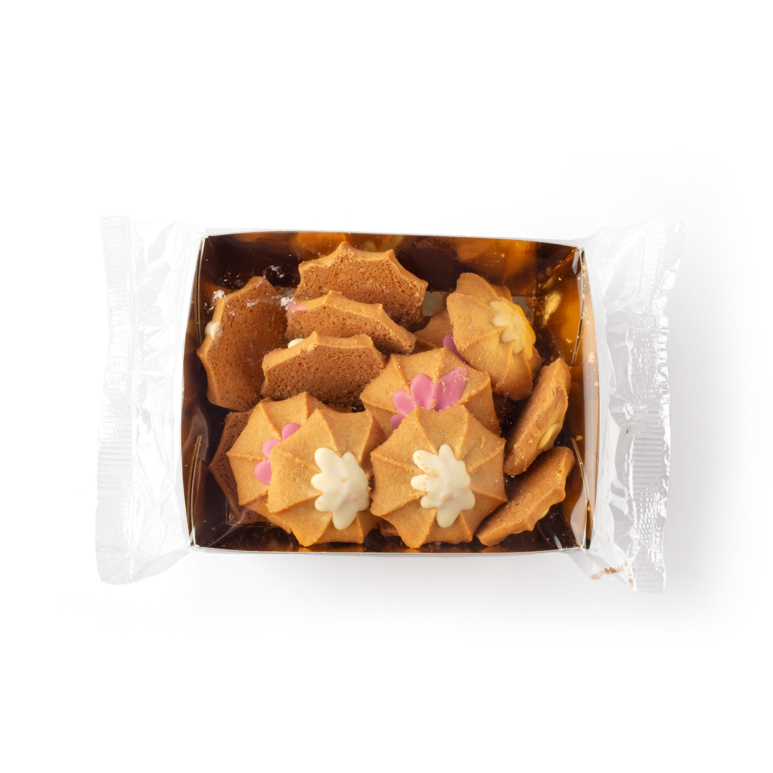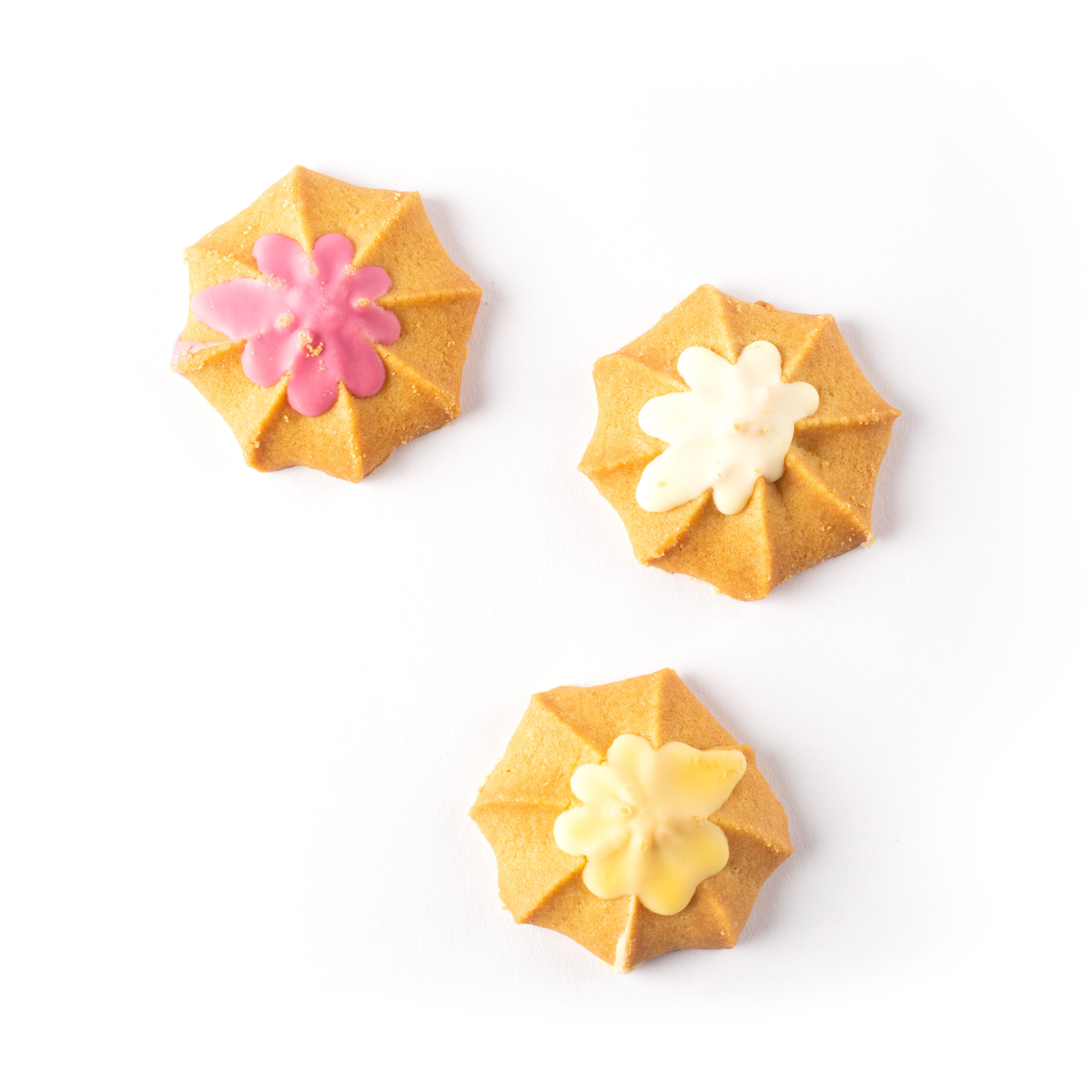Ingrediënten: TARWEbloem, cacaofantasie 21,6% [suiker, plantaardige vetten (Palm, palpmit); magere MELKpoeder, lactose (MELK); emulgatoren: E322 (SOJA)-E476; natuurlijk vanillearoma; kurkuma extract; kleurstof: E120-E160b]; boter (MELK); plantaardige vetten (palm, kokos, raadzaad); zout; EIEREN; invertsuikerstroop; TARWEzetmeel; vanilline; rijsmiddelen: E450i-E500ii-E170; stabilisator: E420; emulgator: E471-E475; kleurstof: E160b(ii); voedingszuur: E330.